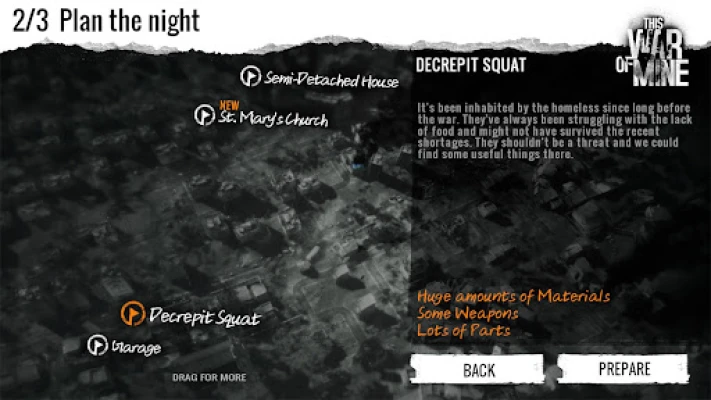 The pace of This War of Mine is imposed by the day and night cycle. During the day snipers outside stop you from leaving your refuge, so you need to focus on maintaining your hideout: crafting, trading and taking care of your survivors. At night, take one of your civilians on a mission to scavenge through a set of unique locations for items that will help you stay alive.